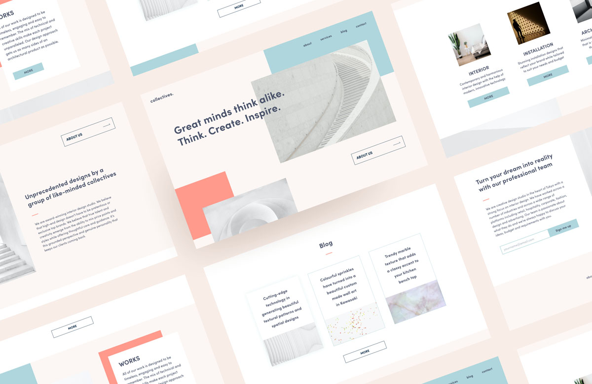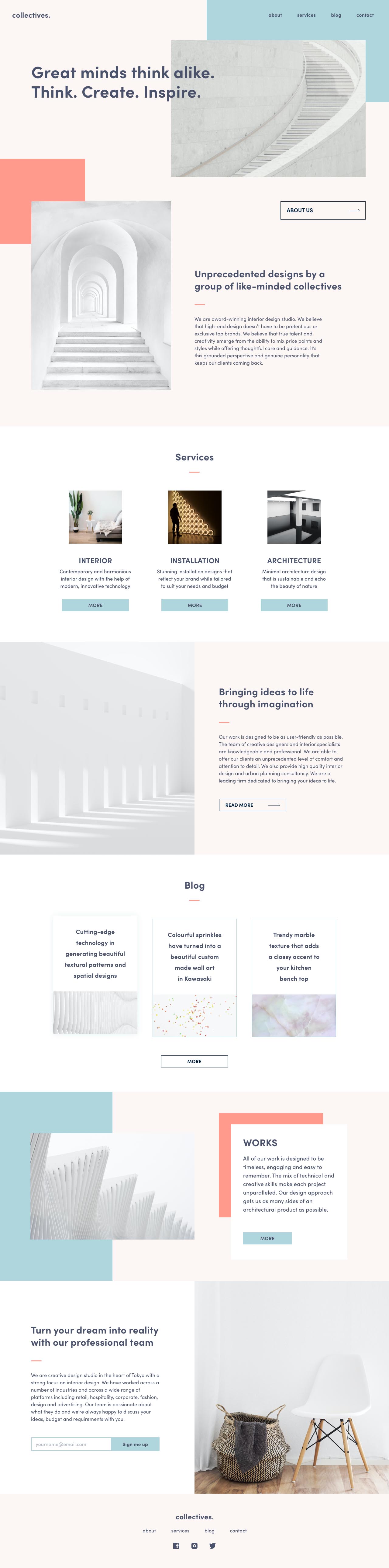 Collectives interior is a project focused on the relationship between forms, colours and space. It utilises high-key images along with a palette of soft pastel colours to bring about a sense of harmony. The minimalist layout of the website echoes with the simple yet enthralling architectural forms.