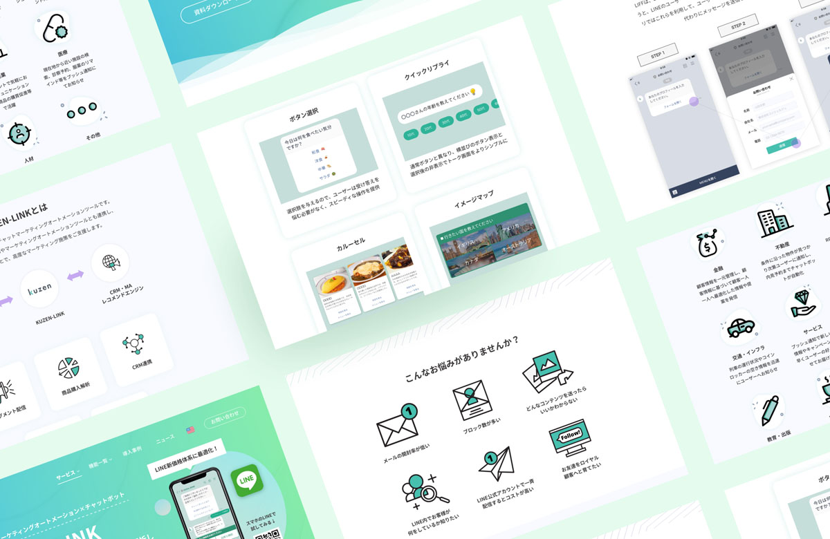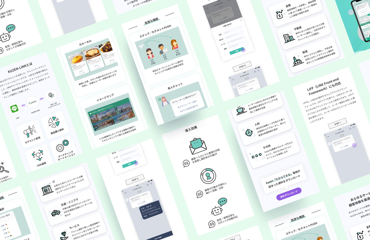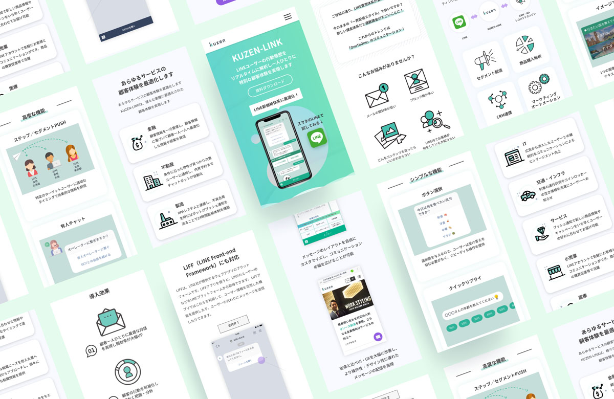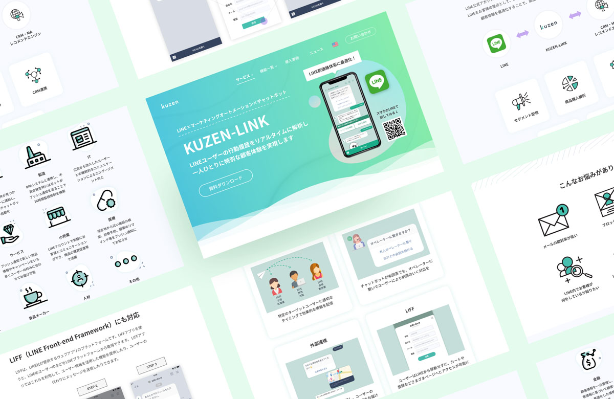 This landing page is created for KUZEN, an AI conversation platform. It features the use of AI conversation system in LINE and highlights a variety of functions that users could utilise through KUZEN, such as flex messages, quick reply, carousels, image mapping, rich menu, operator and external integrations.