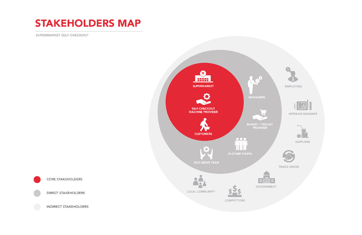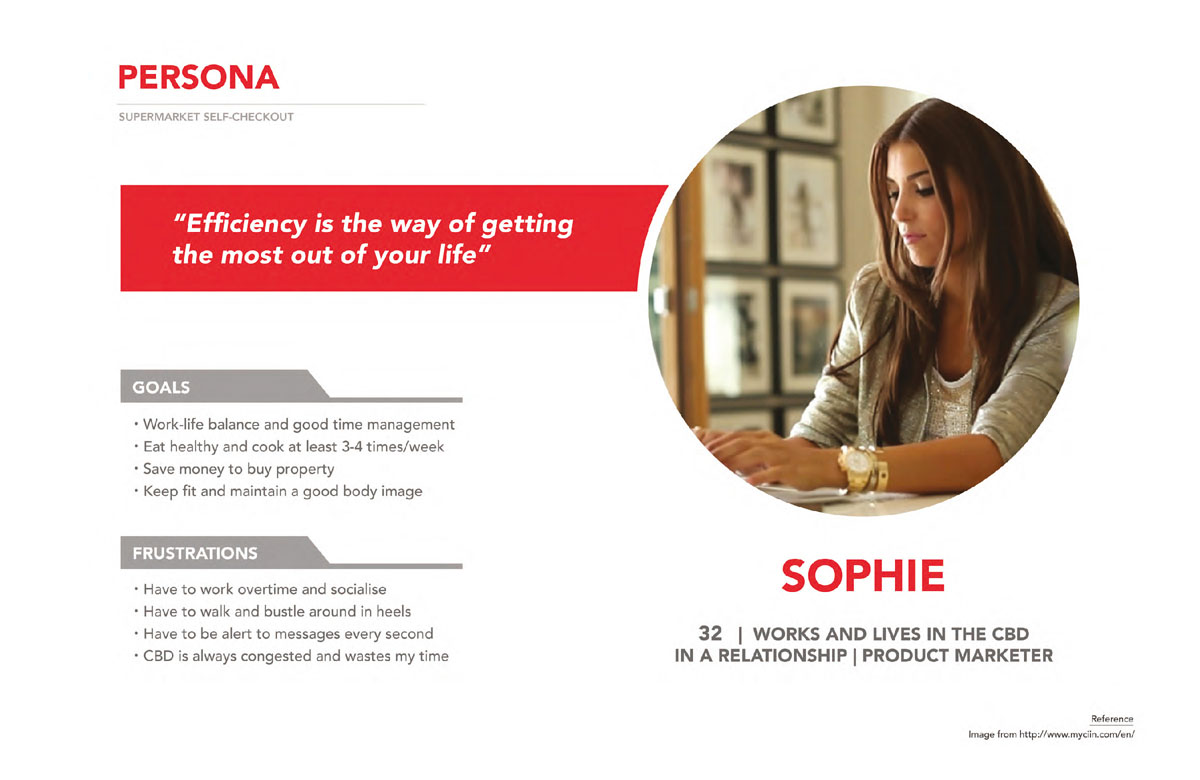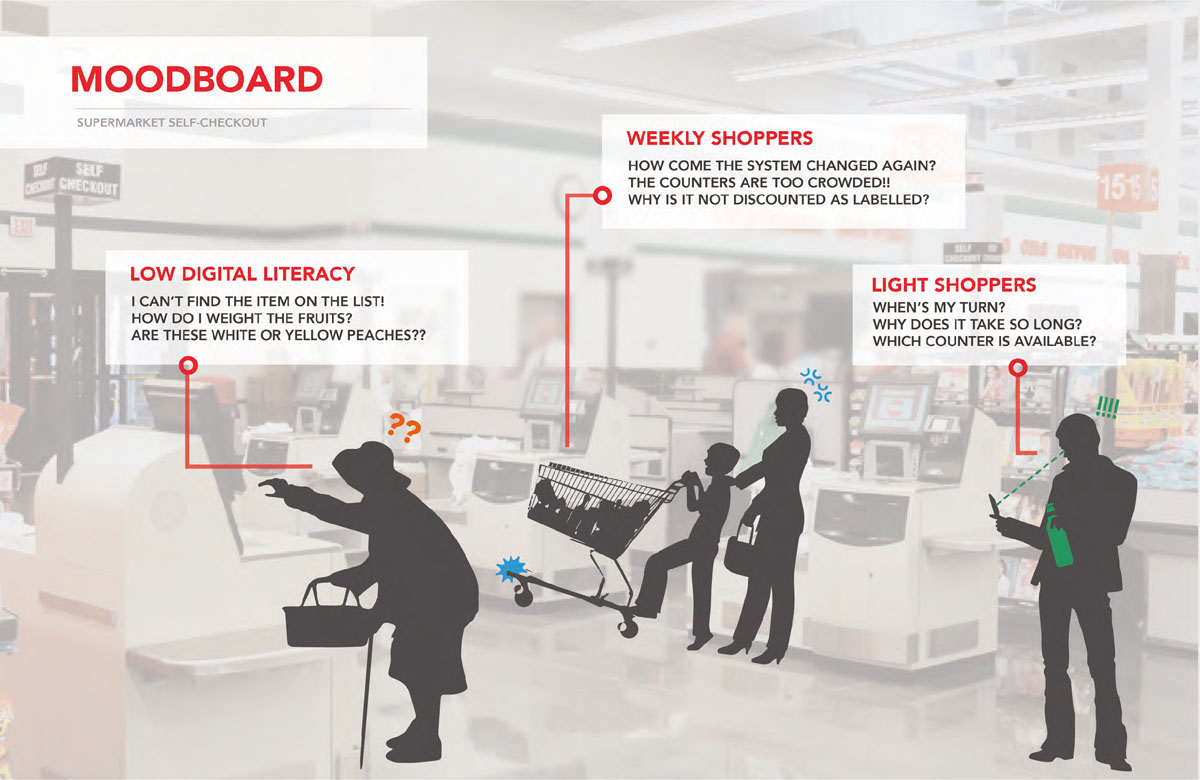 This research includes creating a stakeholders map, a moodboard and a persona. It pinpoints some key challenges supermarkets in the CBD face, such as having a diverse range of customers from various backgrounds and cultures, people with low digital literacy and travellers who are not familiar with the self-checkout system. These visualisations inform some critical aspects to consider when redesigning for the improvement of self-checkout service.