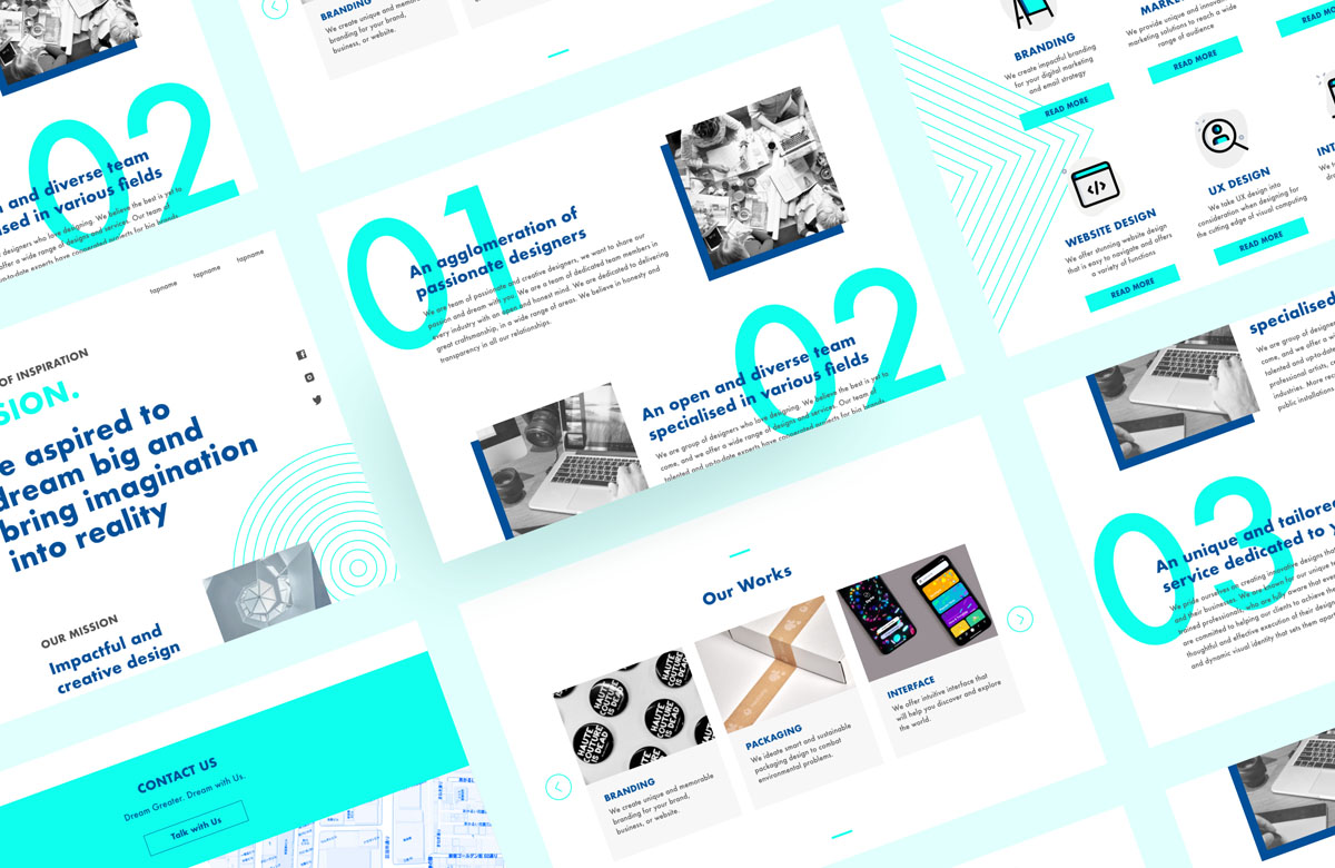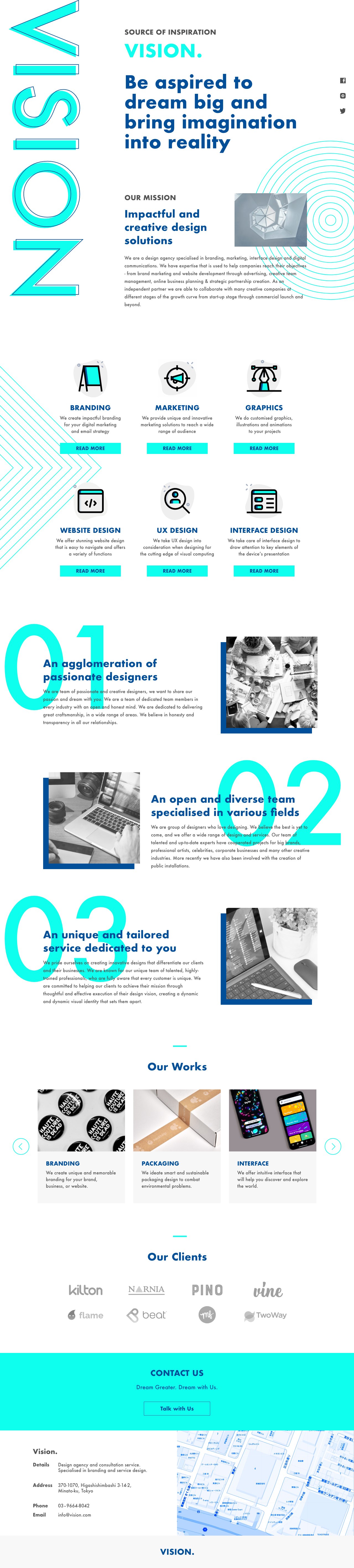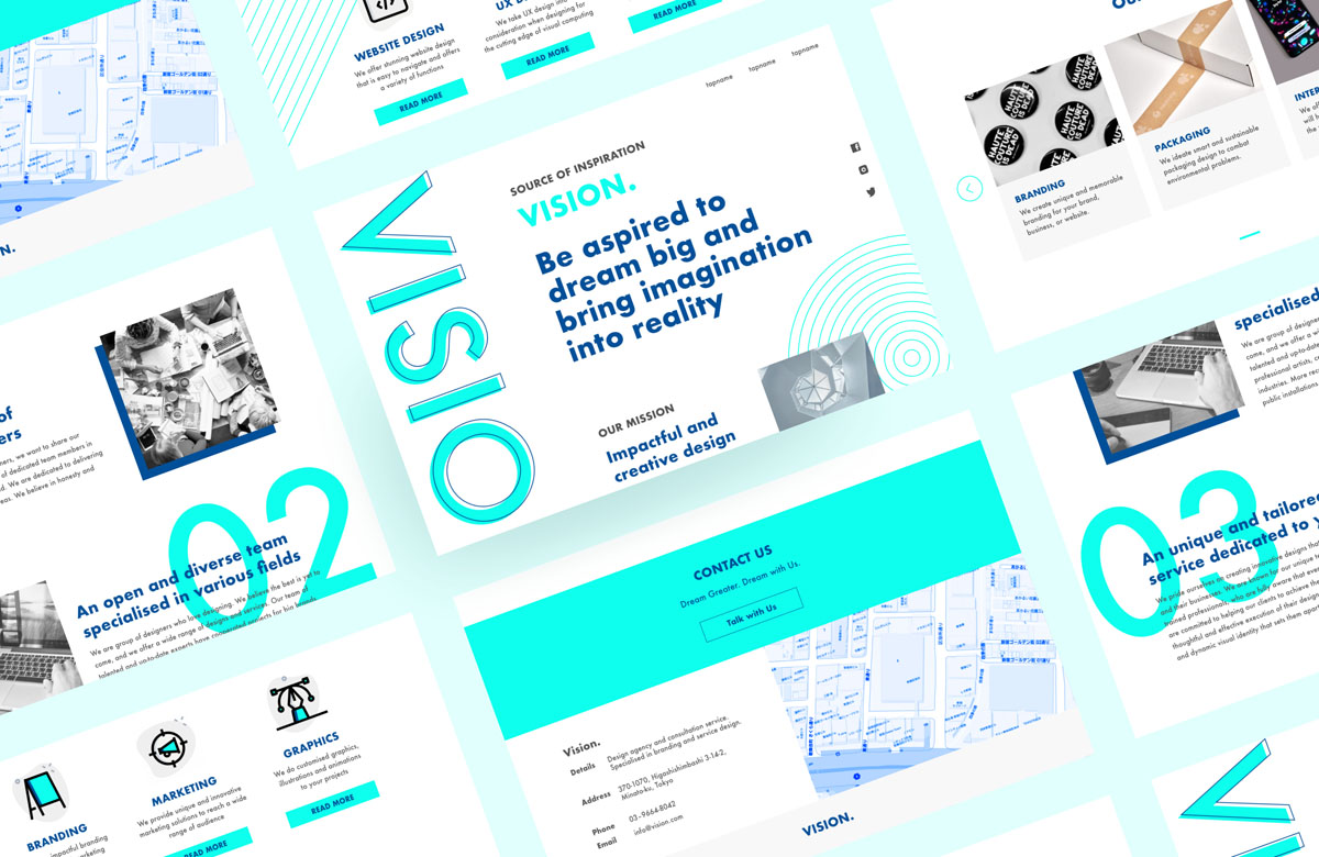 Vision Design is an agency that provides impactful and creative design solutions to businesses. The use of neon colour and bold texts reflect the mission of dreaming big and being ambitious together with clients as they venture into a new realm of their businesses.